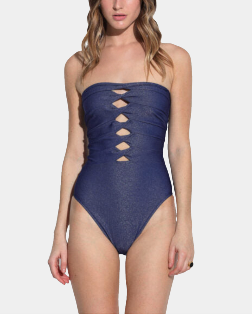 Este bañador bandeau twist de Guillermina Baeza es de tejido denim lúrex. Lleva copas y tirantes extraíbles. La espalda es lisa y su tejido es suave y agradable. La prenda está totalmente forrada, con forro control en la parte delantera que estiliza la figura y proporciona mayor sujeción.