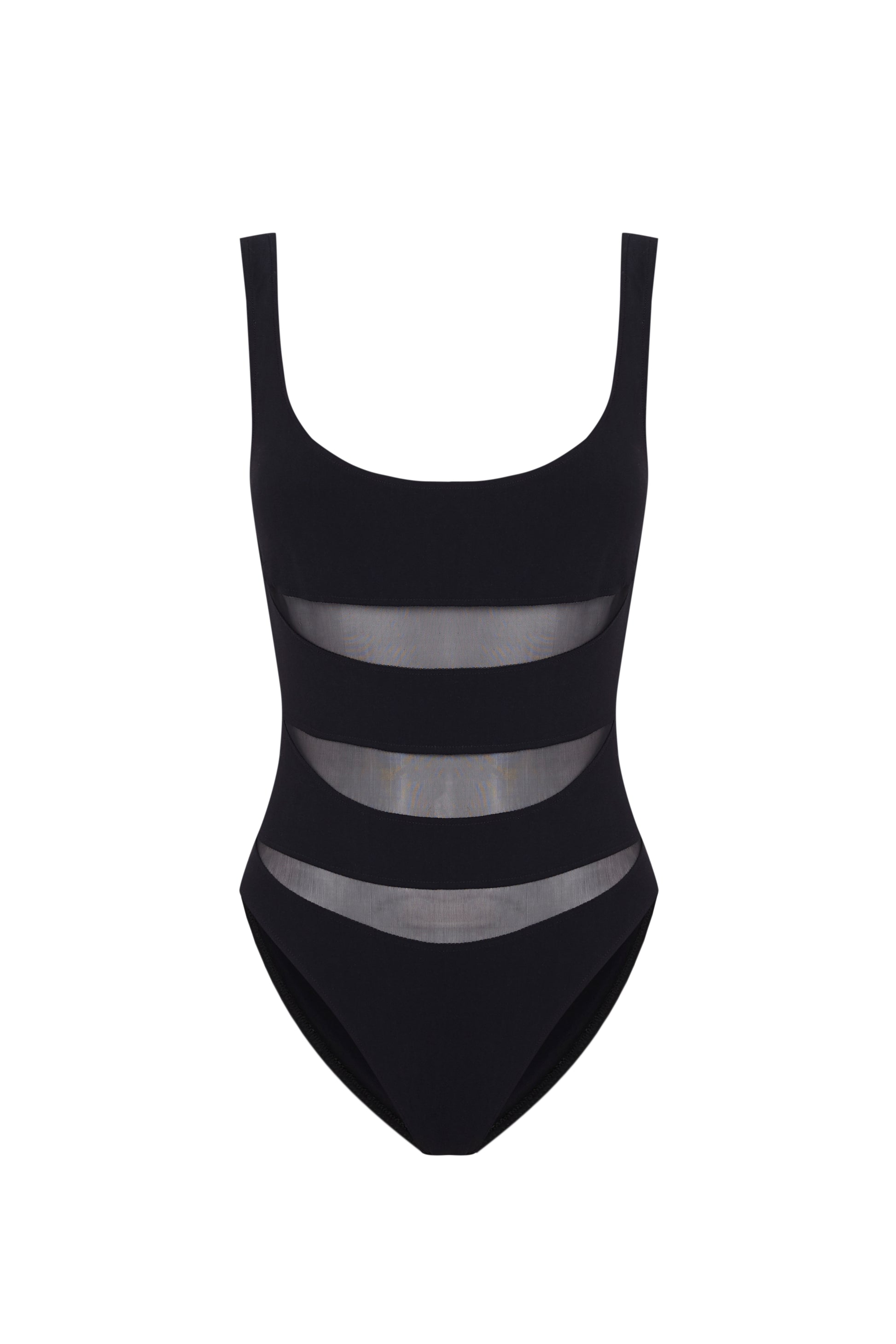 Black swimsuit with a rounded neckline, three cutouts with transparent fabric and an open back.