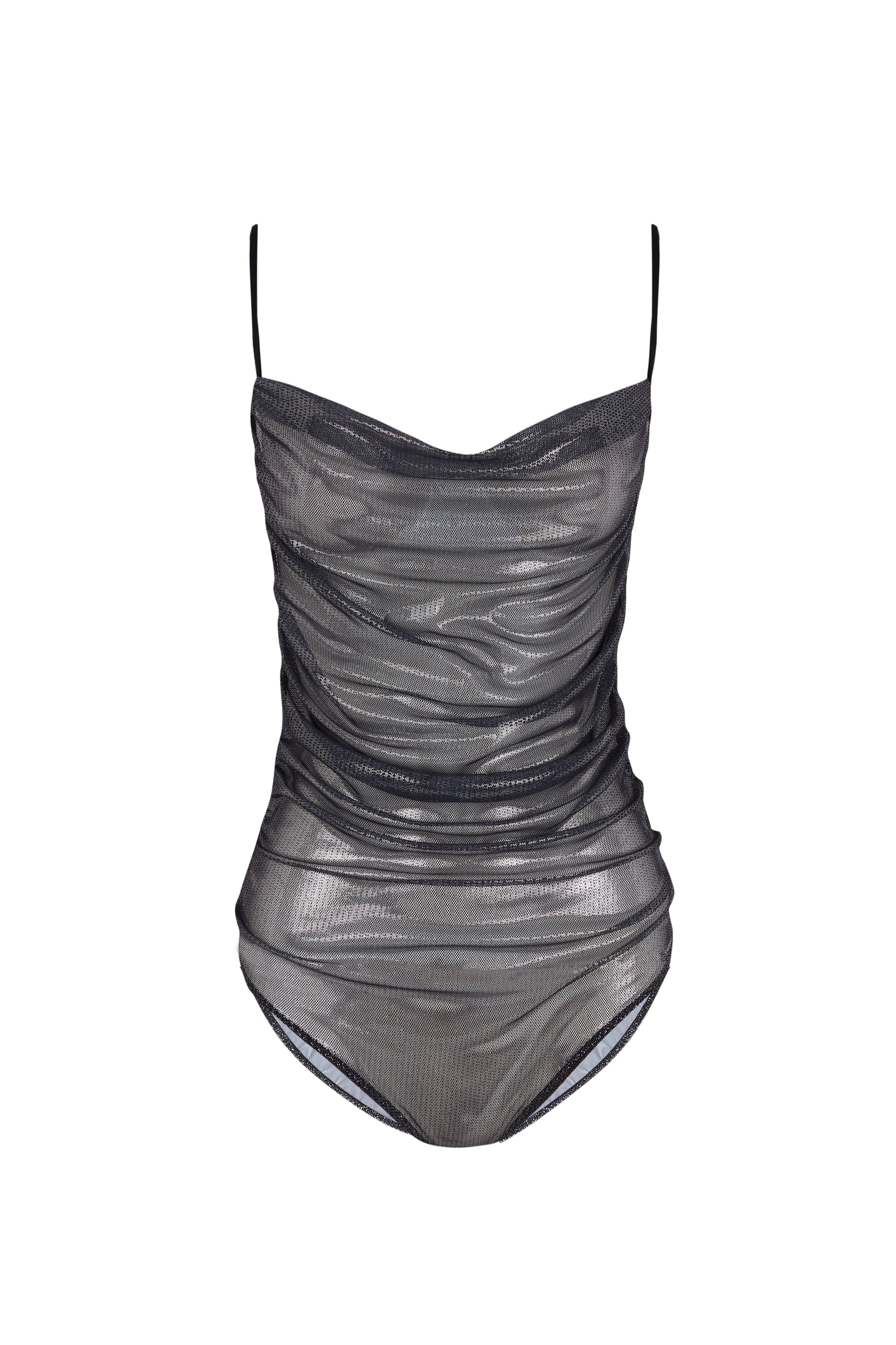 Two-in-one bikini. Draped swimsuit in metallic and sheer mesh with straps and a low open back. Black bandeau bikini with adjustable double ties at the back. Plain bottoms.