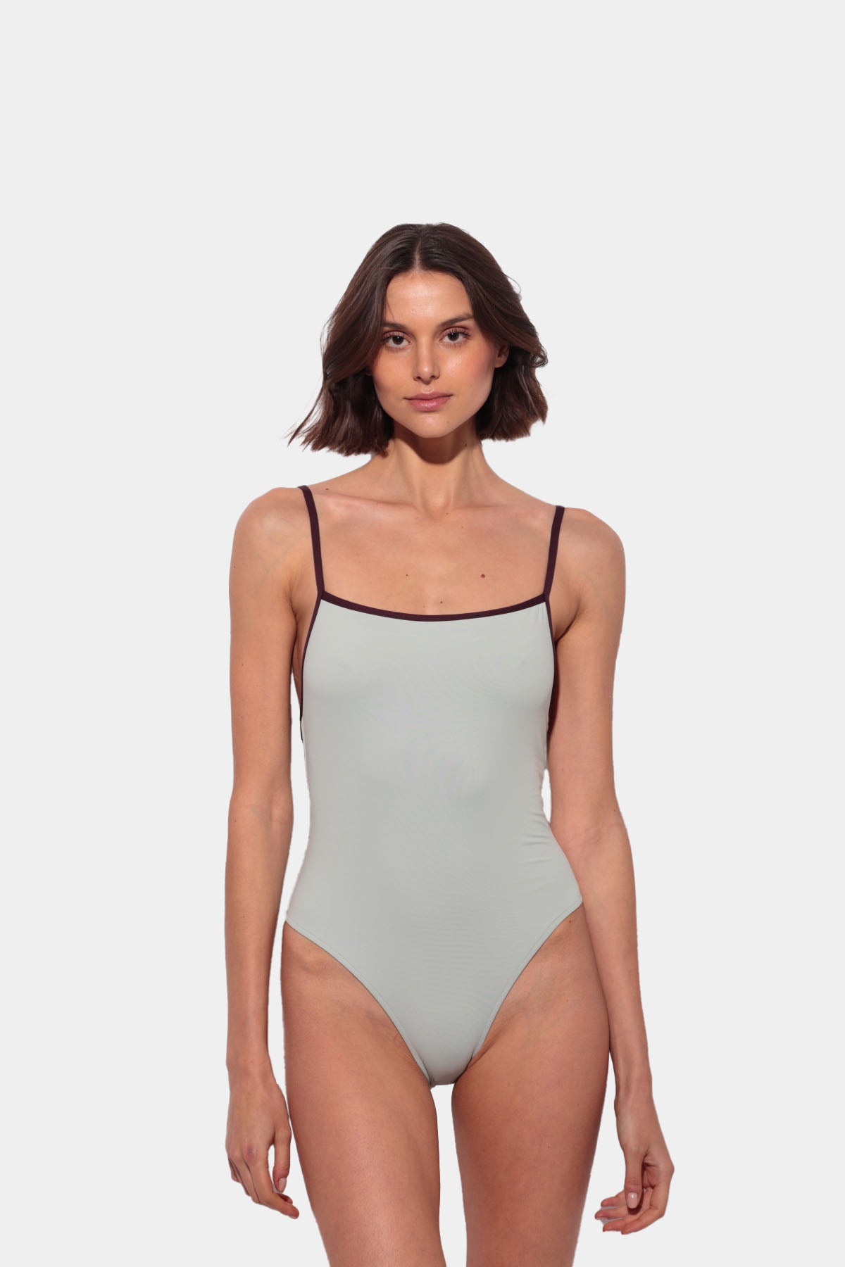 Bañador azul pastel con vivo marrón - Espalda escotada
